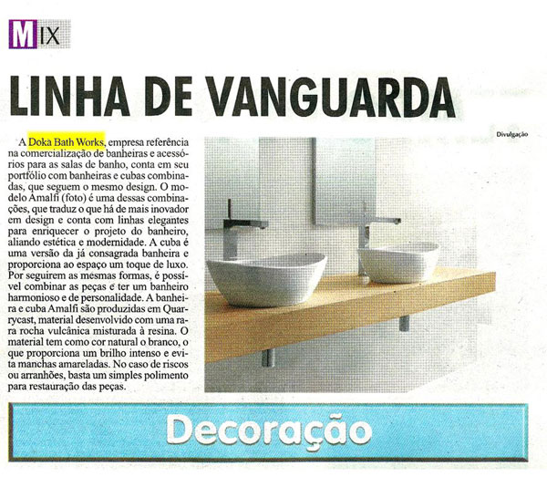 A Doka Bath Works, empresa referência na comercialização de banheiras e acessórios para as salas de banho, conta em seu portfólio com banheiras e cubas combinadas, que segue o mesmo design. O modelo Amalfi é uma dessas combinações, que traduz o que há de mais inovador em design e conta com linha elegantes para enriquecer o projeto do banheiro, aliando estética e modernidade. A cuba é uma versão da já consagrada banheira e porporciona ao espaço um toque de luxo.
