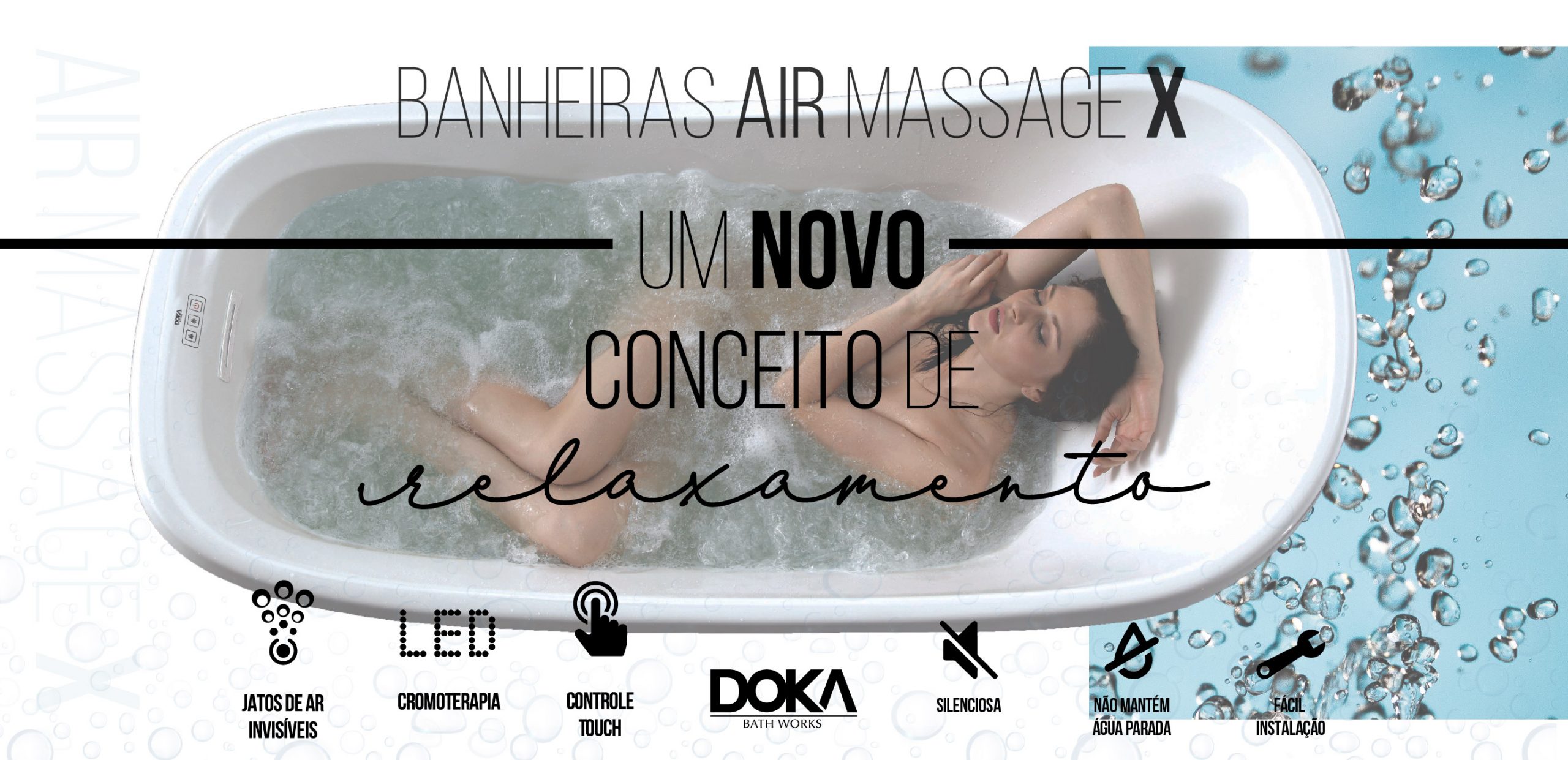 Exclusividade da DOKA as Banheiras Air Massage X possuem um sistema pioneiro que proporciona extremo conforto e sensação única de relaxamento. Ao contrário das hidromassagens, os jatos que a tecnologia proporciona são de ar, não de água, o que gera menor incômodo e maior refrescância ao usuário.