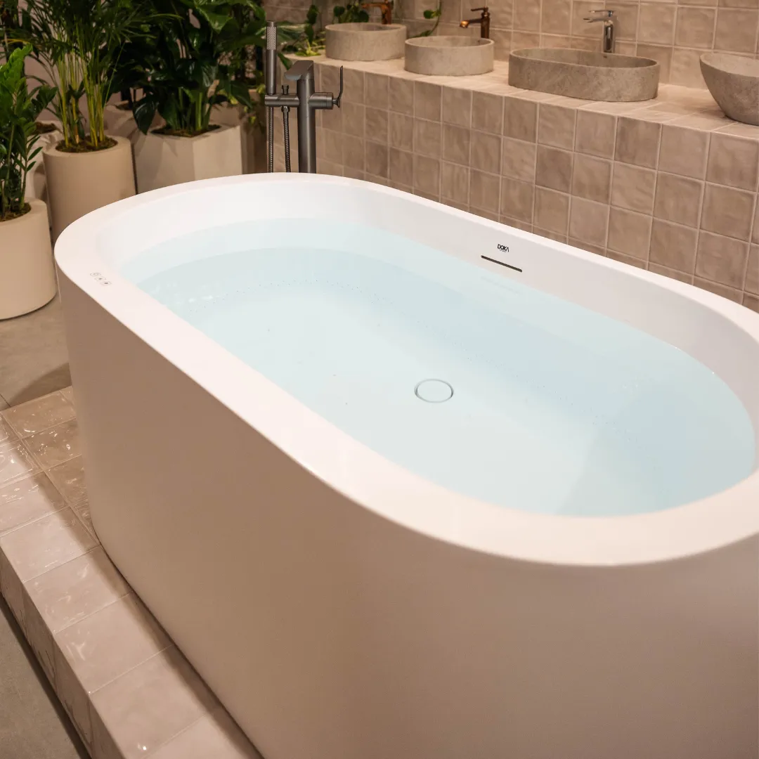 Ademais, a banheira exibe uma estética sofisticada e refinada, com acabamento em Matt White (fosco) ideal para banheiros contemporâneos e Glossy White (brilhante) perfeito para salas de banho modernas. Seu design freestanding (autônomo) confere elegância e praticidade, sendo ideal para qualquer espaço, já que elimina a necessidade de revestimentos elaborados ou instalações complexas.