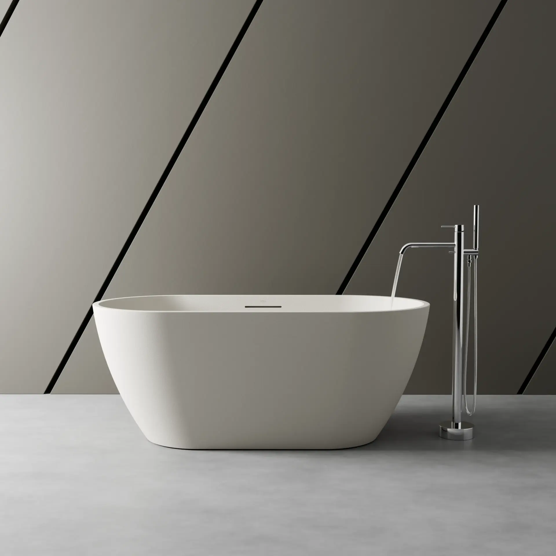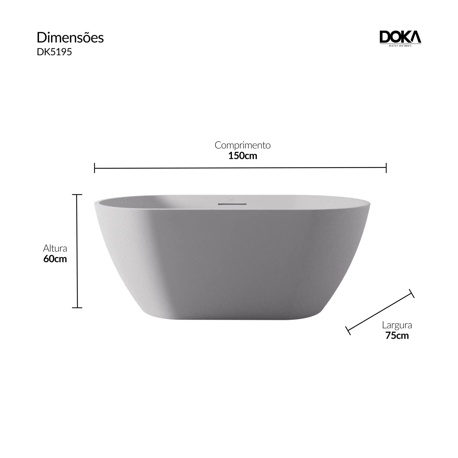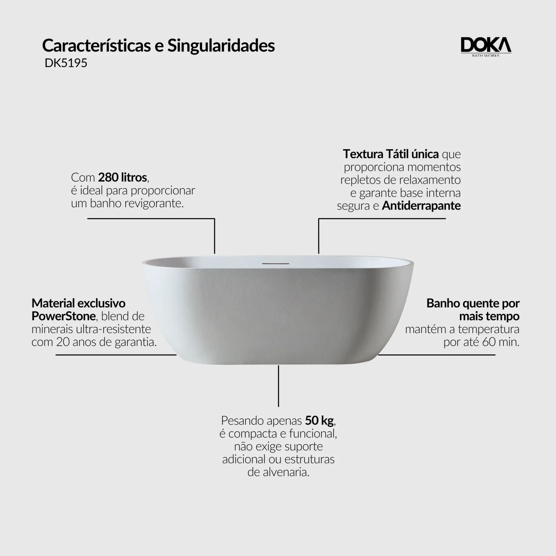 Projetada para instalação freestanding, a banheira não requer alvenaria, simplificando o processo de montagem e permitindo mais flexibilidade no layout do ambiente. Seu acabamento sofisticado está disponível em cinco tonalidades: