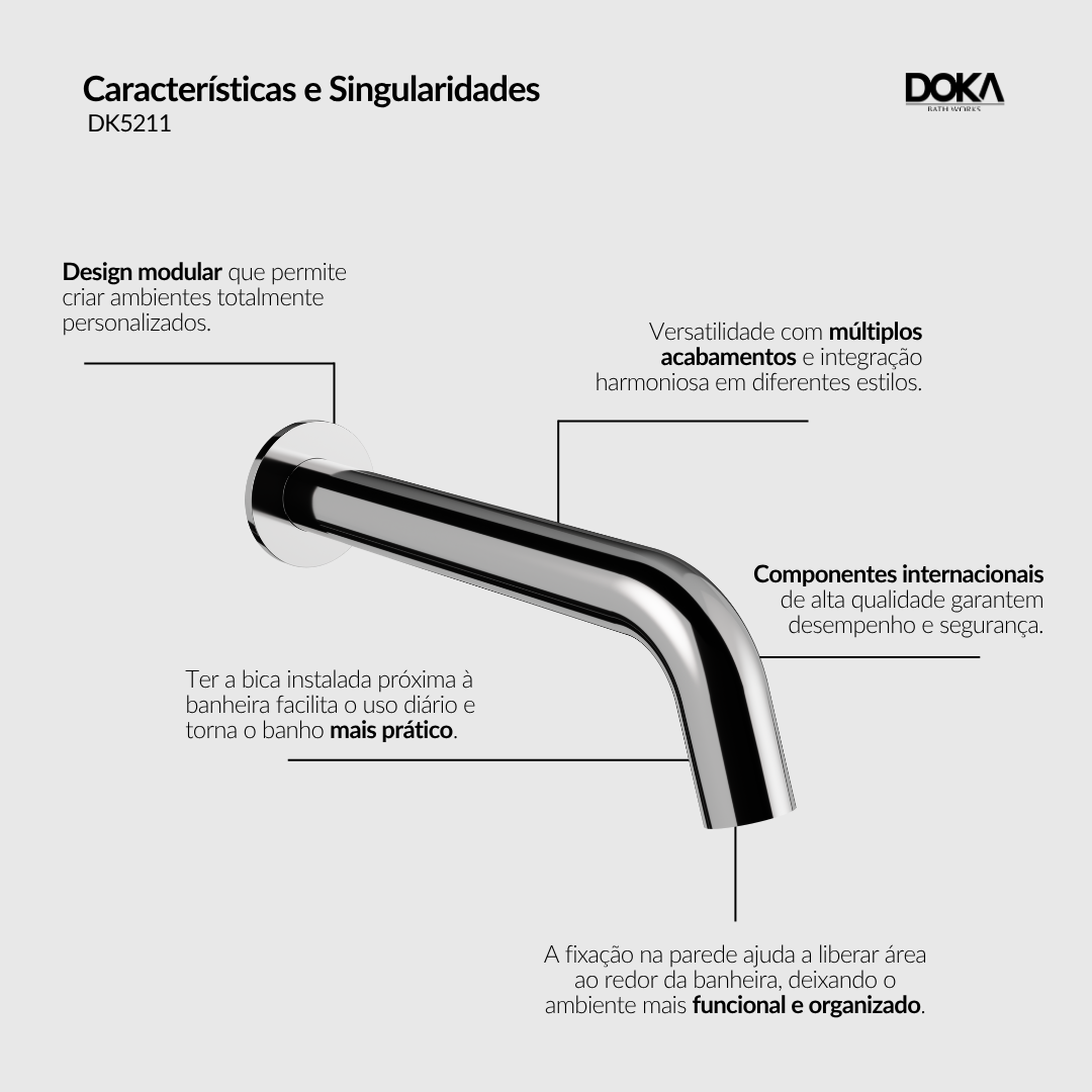 A Bica de Parede para Banheira da linha Quantum é uma peça indispensável para quem busca praticidade e elegância no momento de encher sua banheira. Com um design moderno e funcional, essa bica tem a capacidade de encher a banheira de forma rápida e eficiente. Isso proporciona um enchimento mais veloz, permitindo que você possa desfrutar de seu banho relaxante sem longas esperas, ideal para quem valoriza conforto e otimização de tempo.