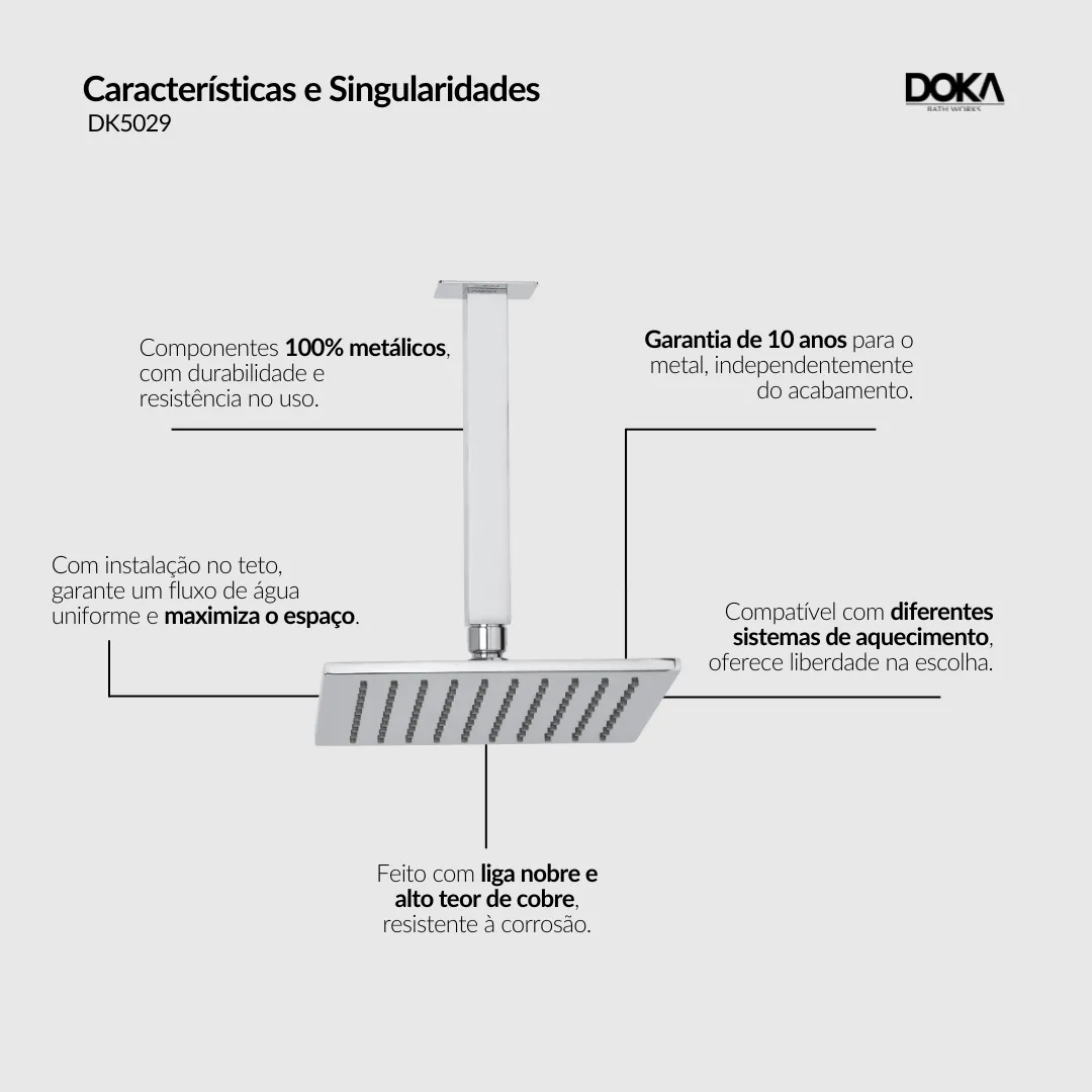 Portanto, ao escolher o Chuveiro de Teto Rainbow Doka, você investe não apenas em um produto de design elegante, mas também em uma experiência de banho aprimorada, onde o luxo, a personalização e a eficiência se encontram em perfeita harmonia.