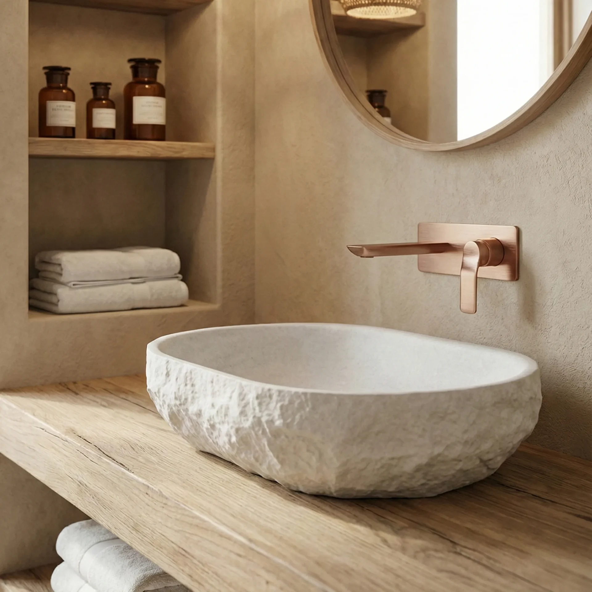 O grande diferencial está na superfície externa cuidadosamente trabalhada. Cada detalhe reproduz a irregularidade natural da pedra, criando uma experiência tátil autêntica. Ao mesmo tempo, o interior liso assegura conforto e praticidade no uso diário. Esse equilíbrio entre sensorial e funcional eleva a Cuba de Apoio Oval pedra GeoStone Doka a um novo patamar de protagonismo no lavatório.