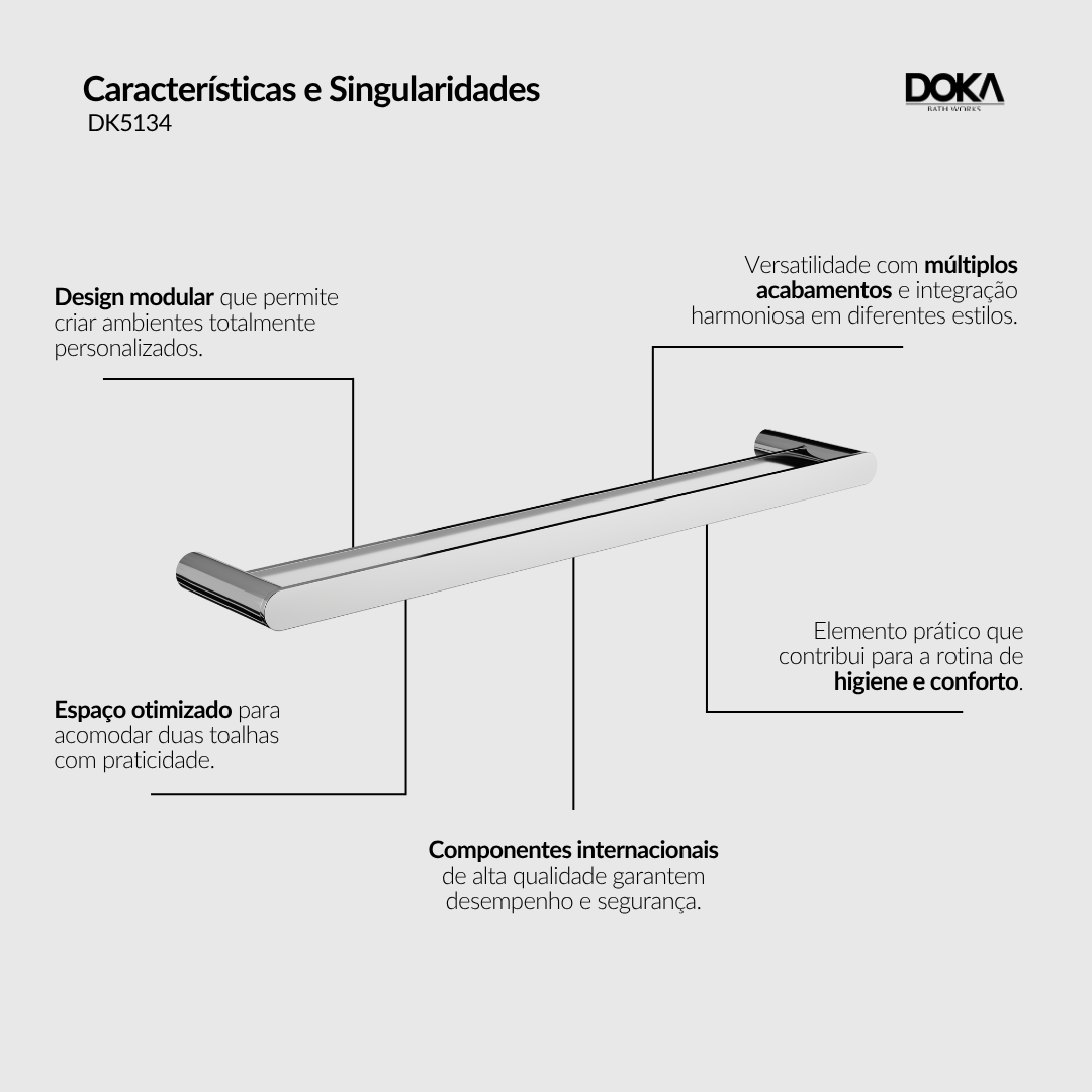 Ao escolher o Toalheiro Duplo Doka Quantum, você transforma um acessório funcional em um elemento de design que valoriza o ambiente. Seja para otimizar espaço ou para trazer elegância ao seu banheiro, o Toalheiro Duplo Quantum oferece a solução ideal para quem busca praticidade e estilo em uma única peça.