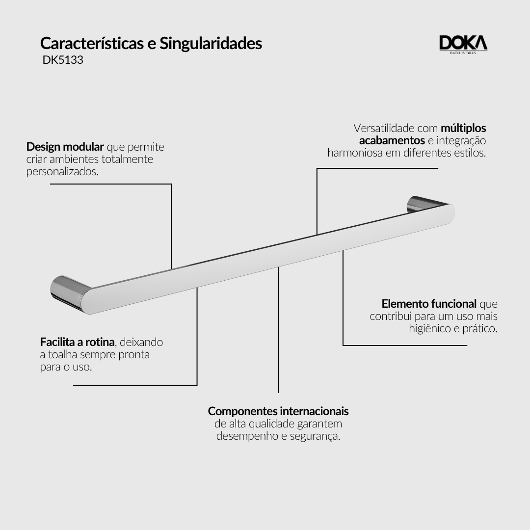 Com a linha Quantum, a Doka entrega um produto que une estética, praticidade e durabilidade. Se você quer renovar seu banheiro ou adicionar um toque moderno ao seu espaço de banho, o Toalheiro de Parede Doka Quantum oferece um equilíbrio perfeito entre design e funcionalidade.