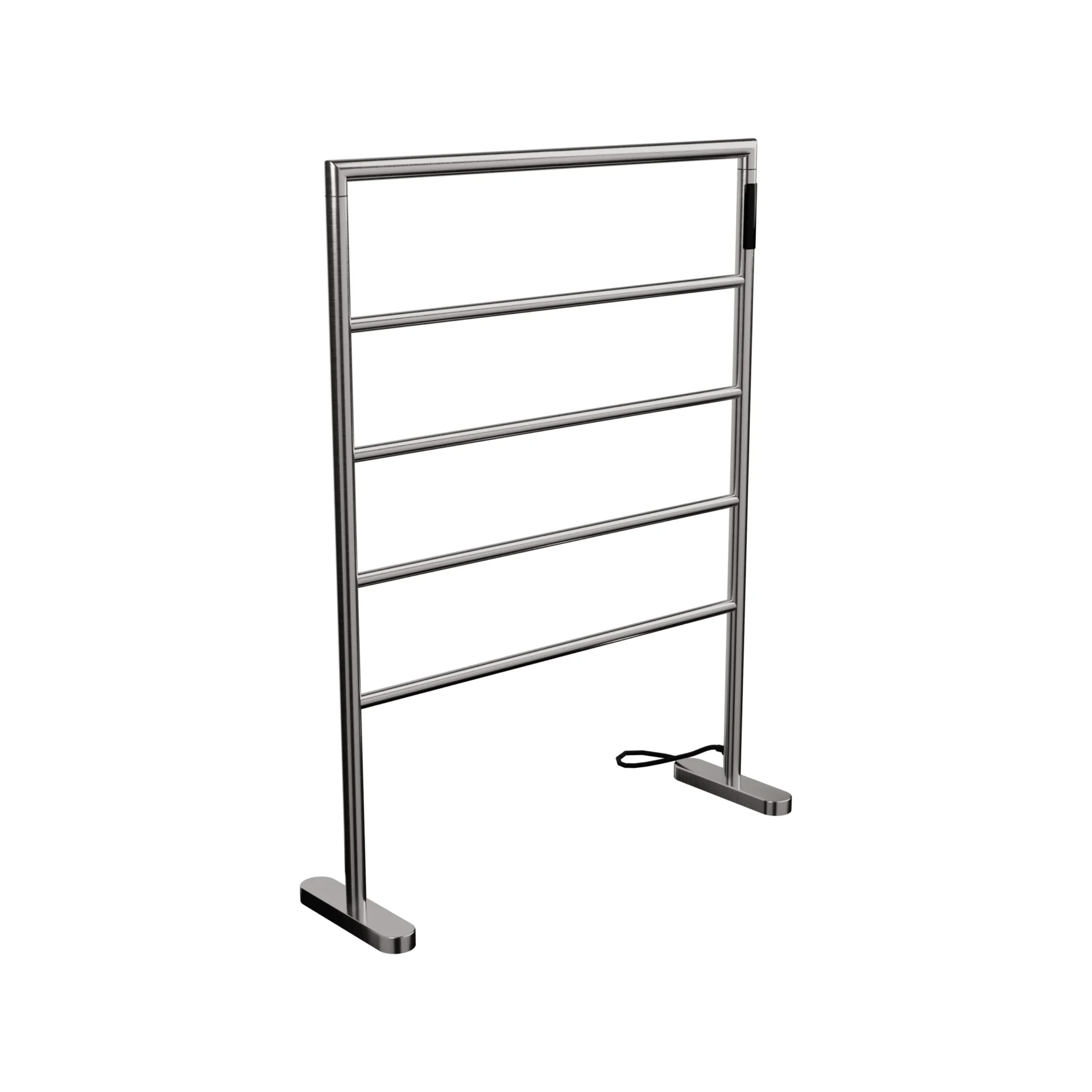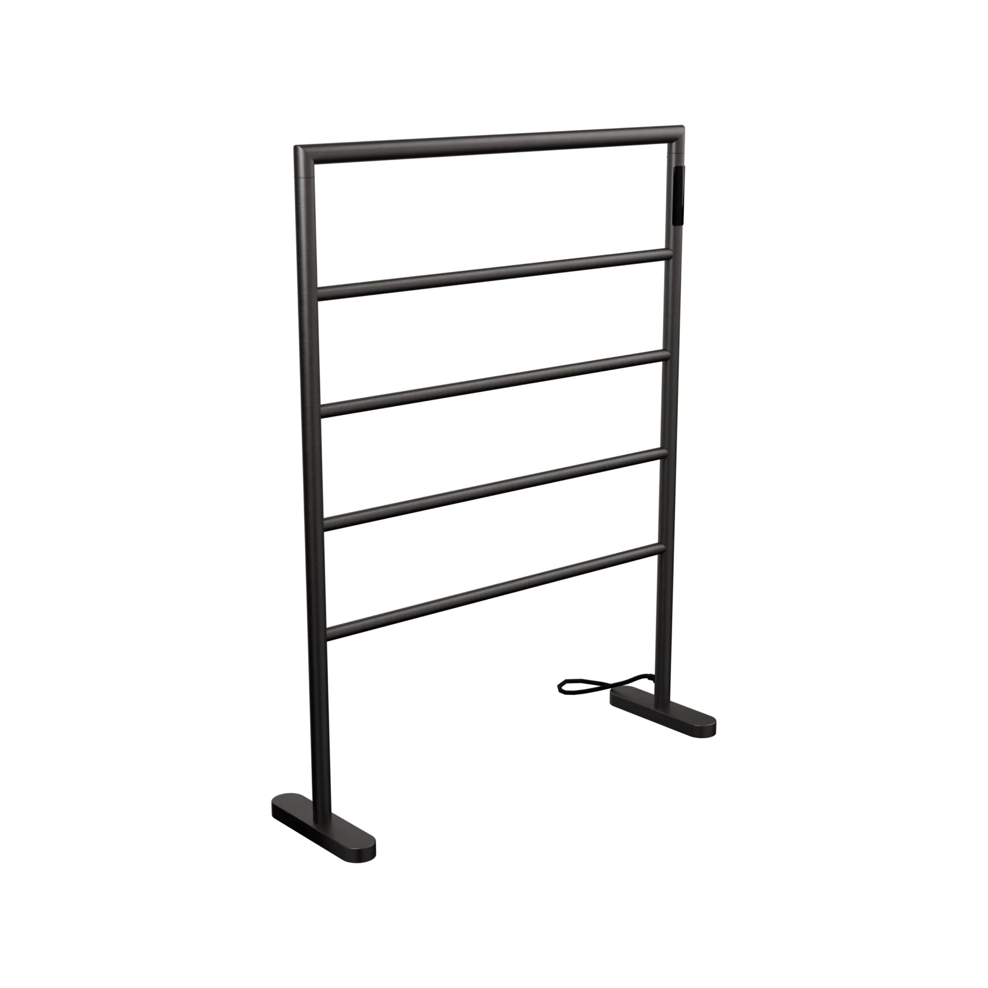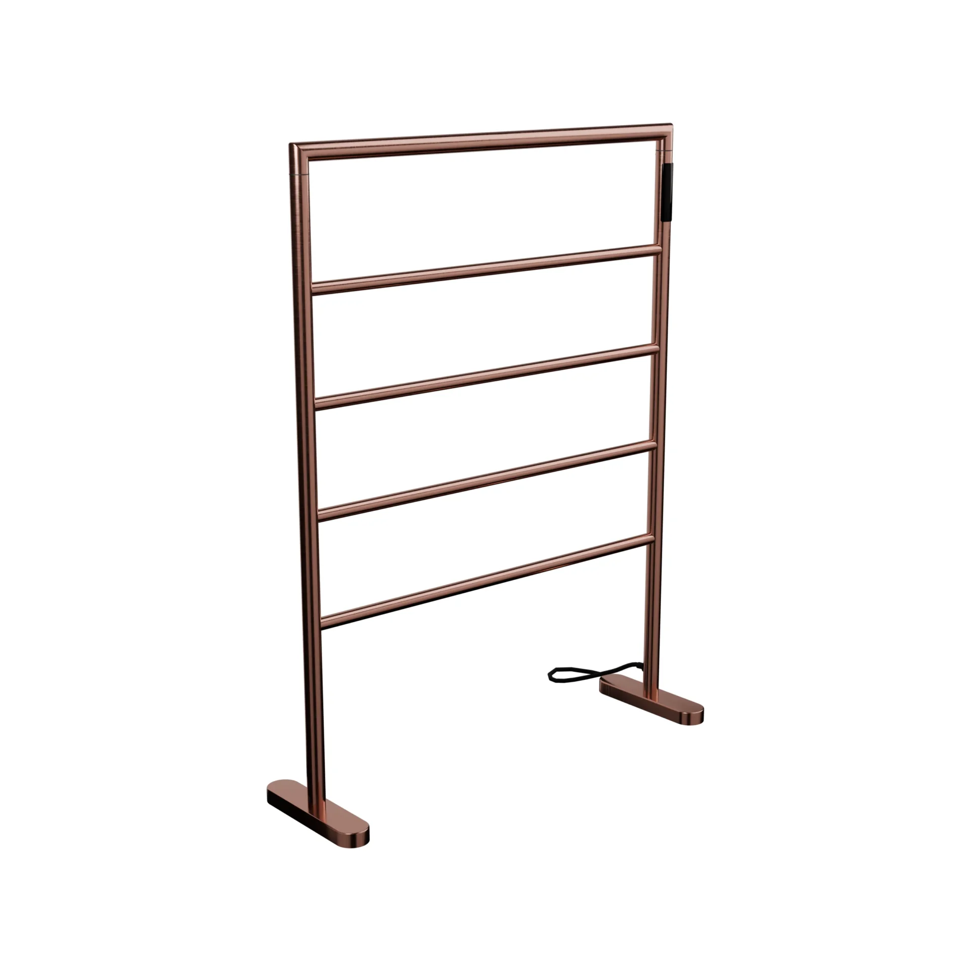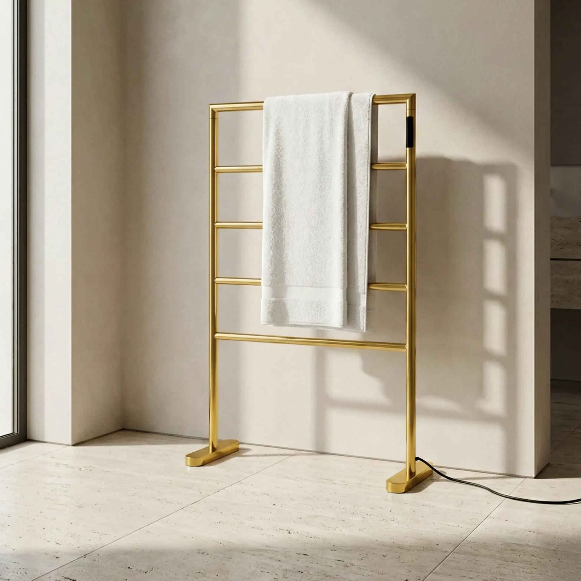 O Toalheiro Térmico de Piso transforma um elemento funcional em protagonista do ambiente. Com estrutura independente e cinco barras horizontais, ele organiza, aquece e valoriza a composição do banheiro. Ao mesmo tempo, sua presença vertical cria ritmo visual e reforça a linguagem arquitetônica do projeto. Ele não depende da parede para existir — e é justamente isso que amplia suas possibilidades de aplicação.